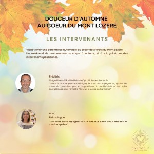 7 experts conjuguent leurs talents pour vous accompagner : Émilie, professeure de yoga et masseuse, apporte souplesse et détente ;Frédéric pour les soins énérgétiques et la clarification au pendule ,Ana pour la détente corporelle et la sophrologie ,Ludivine pour ses conseils en fleurs de Bach et ses créations artistiques , Michel partage son expertise en thérapie ayurvédique, cette science millénaire du bien-être ; et Marie-Noëlle met à votre service ses compétences en kinésithérapie, microkinésithérapie et méditation. Chacun contribue à créer une expérience unique, profondément ancrée dans ce territoire d’exception.
